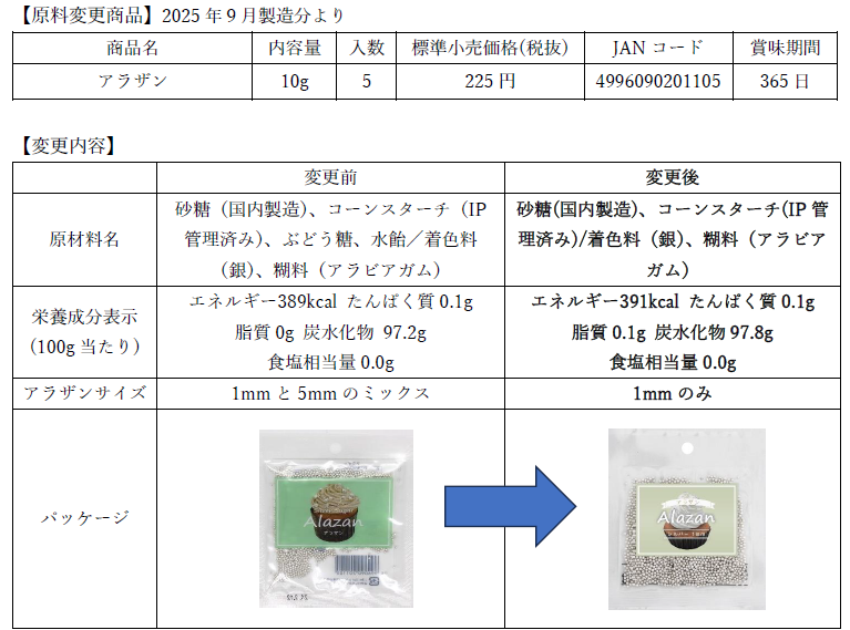 この度、現在お取り扱い頂いております弊社商品「アラザン10g」につきまして、アラザンのサイズ、原材料及びパッケージを変更させていただくこととなりました。尚、これにより一括表示の原材料名が変更となりますが、内容量・価格・JANコード・賞味期間に関しての変更はございません。