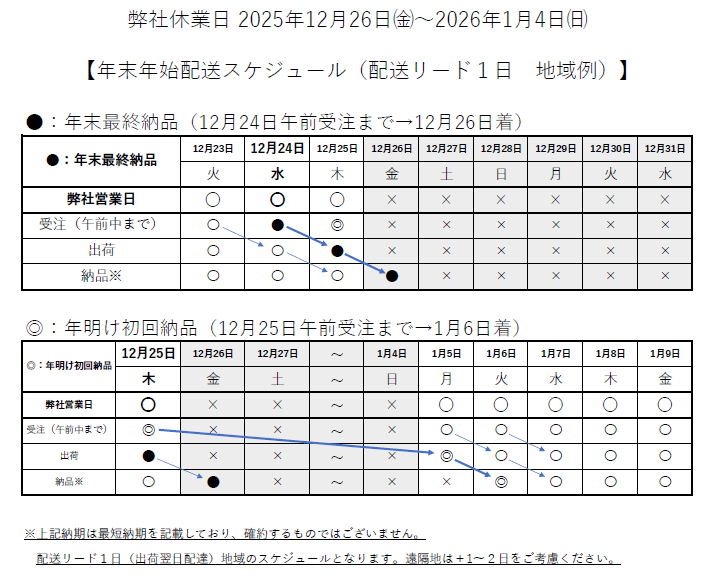 年末年始は配送の混雑が予想され、遅配・誤配の可能性がございます。余裕を持った納期指定をお願いいたします。