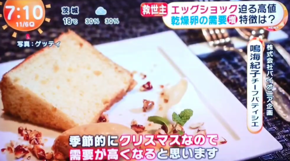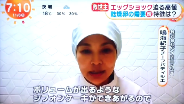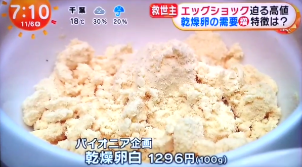 2025年11月6日(木)放送のフジテレビ「めざましテレビ」において、鶏卵価格の高騰に関する特集の中で、当社が販売する乾燥卵白が紹介されました。