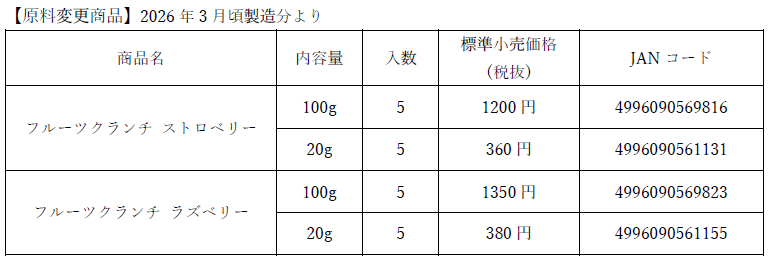 この度、現在お取り扱い頂いております弊社商品「フルーツクランチ ストロベリー20g」、「フルーツクランチ ストロベリー100g」、「フルーツクランチ ラズベリー20g」、「フルーツクランチラズベリー100g」につきまして、フルーツクランチ各種の原料仕様変更に伴い、一括表示を変更することといたしました。
